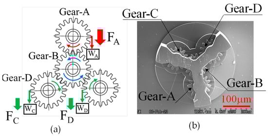 Experiments on power transmission from a peripheral gear (Gear-A) through Gear-B to the two surrounding gears (Gear-C and -D), shown in Figure 8a, were carried out using a micro-torque wrench made of platinum wire on the input gear, as shown in Figure 6a,b, to measure the torque, as shown in Figure 10a.