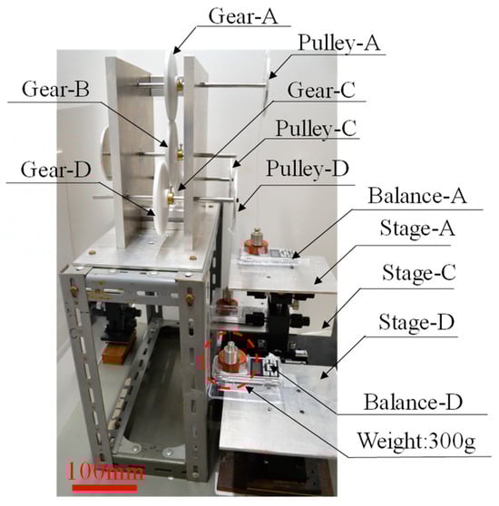 Gears-C and -D are also supported, as in the case of Gear-A, by soft wires placed around the circumferences of the pulleys (100 mm diameter) mounted on shafts supported by bearings on the respective gears (100 mm diameter), as shown in Figure 8b, and by 0.300 kg weights mounted on the electronic balance on Stage-C and -D.