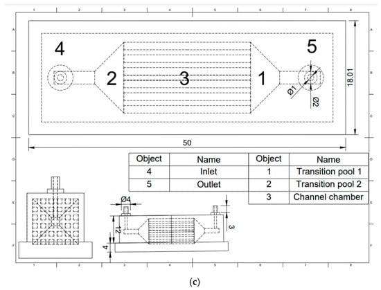 Digital representations of (a) the single-channel microreactor and (b) the multi-channel parallel microreactor system. Pictures of both reactors were taken after rendering in Fusion 360 (Autodesk) based on the original CAD files. (c) Schematic representation of the multi-channel microreactor. The schematic was generated using the Autodesk “Design” feature based on the original design (dimensions in mm).