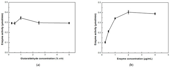 For the optimization of the immobilization process in the single-channel microreactor, two parameters were investigated: glutaraldehyde and enzyme concentration. Glutaraldehyde is a commonly used cross-linker that can connect the amine groups on a supporting material surface and the amine groups on an enzyme surface, by the formation of a Schiff’s base [33]. Thus, glutaraldehyde was used as a cross-linker for the covalent immobilization of β-glucosidase on chitosan. The proportion of glutaraldehyde during the immobilization procedure is critical; thus, different glutaraldehyde concentrations were studied, and the results are depicted in Figure 3a. As seen, the best glutaraldehyde concentration was found to be 1% v/v which provided a 15% relative increase in the enzymatic activity compared to lower or higher concentrations. Large concentrations of glutaraldehyde may result in lower enzymatic activity due to interactions of glutaraldehyde with important amino acid residues for the function of the enzyme. Furthermore, multiple bonds between chitosan and the enzyme may result in restriction effects that further lower the catalytic capabilities of the enzyme [34]. On the contrary, low concentrations of the cross-linker may result in insufficient immobilization of the enzyme [35]. The 1% v/v glutaraldehyde concentration was chosen as the optimal.