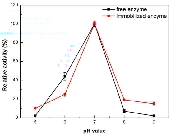 Effect of pH on the catalytic activity of the free and immobilized β-glucosidase in the single-channel microreactor. The value of 100% indicates the maximum observed activity at pH = 7.0.