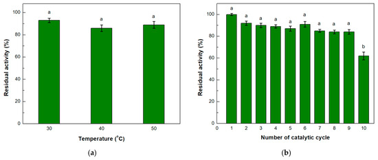 (a) Thermal stability and (b) operational stability of immobilized β-glucosidase on the single-channel microreactor. The value of 100% indicates the enzyme activity at t = 0 and in the first catalytic cycle for thermal and operational stability, respectively. Means with different letters are statistically significant (p < 0.05).