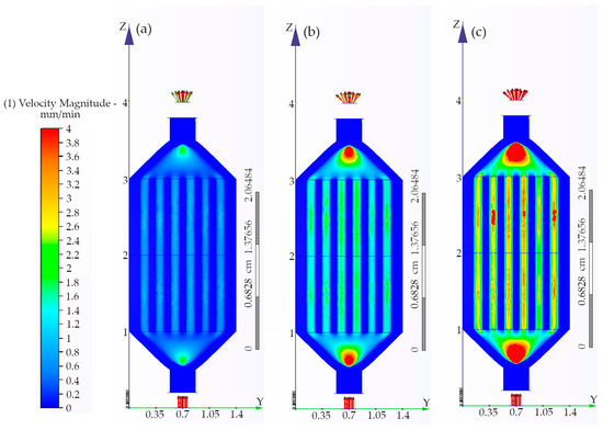 Schematic representation of flow distribution in the multi-channel parallel microreactor based on CFD simulations by the CFD software (Autodesk): (a) 50 μL/min, (b) 150 μL/min, and (c) 250 μL/min.