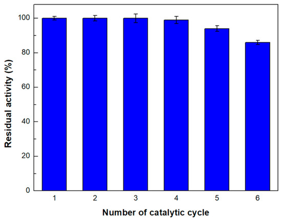 Furthermore, the reusability of the multi-channel microreactor was investigated for six successive catalytic cycles. As seen in Figure 8, the microreactor retains over 80% of its initial enzymatic activity, indicating that this configuration could be effectively applied for continuous catalytic cycles.