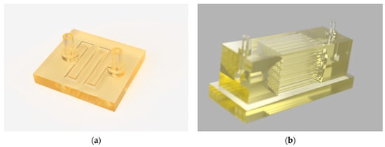 The 3D computer-aided (CAD) models were designed in the 3D modeling environment of the Fusion 360 software (Autodesk). Two scaffolds were created for this work: a single-channel microreactor with a capacity of 30 μL and a multi-channel parallel microreactor (Figure 1). The single-channel microreactor consisted of a circular channel with an internal diameter of 0.8 mm. The channel was designed in a curvilinear pattern to render the printed structure more compact. The model also incorporated an inlet and an outlet. The multi-channel parallel microreactor was designed with a total capacity of 1.52 mL. The design consisted of three modules, two transition modules (0.45 mL), one parallel microreactor module (0.72 mL), an inlet, and an outlet with diameters of 1 mm. The transition modules guarantee a smooth transition from the inlet and outlet flow to and from the parallel reactor module. The parallel reactor module consisted of 36 rectangular channels with a width and length of 1 mm, while its height was 20 mm.