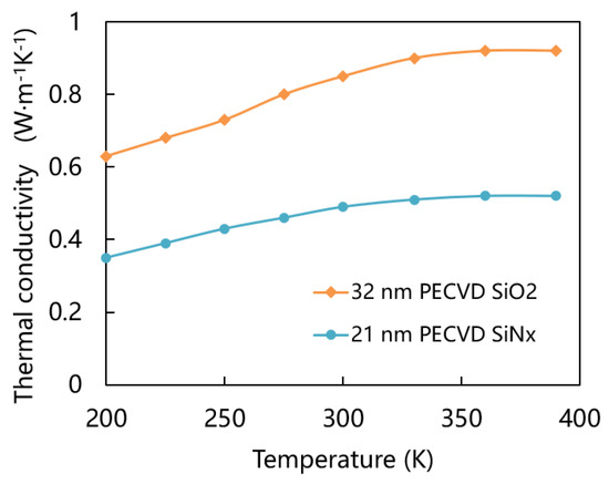 Thermal conductivity of 32 nm thickness SiO2 and 21 nm thickness SiNx versus temperature [28].
