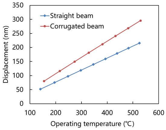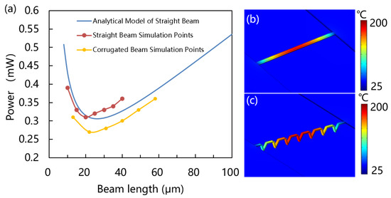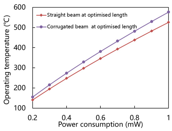 Figure 8 shows power consumption versus operating temperature of straight and corrugated beam at various optimized lengths. It is obvious that under the same power consumption, the operating temperature achieved by the corrugated beam is higher than that of the straight beam. Therefore, the corrugated beam has less heat loss. Both structures consume less than 1 mW of power even at operating temperatures of 500 °C.