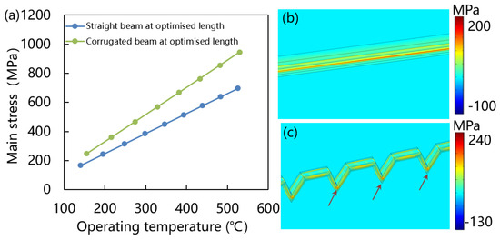 Stress analysis of straight and corrugated beam. (a) Main stress versus operating temperature of straight and corrugated beam at optimized length. (b) Main stress distribution of 15 m length straight beam at 200 °C. (c) Main stress distribution of 22 m length corrugated beam at 200 °C.