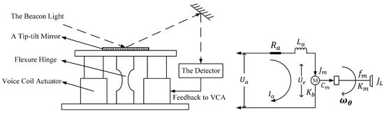 The structure of the 1-DOF FSM and the simplified physical model structure are illustrated in Figure 2. The mirror, driven by the actuator, reflects the beacon light into the target detector. The controller works to minimize the error between the position of the beacon light and the centroid of the target detector.
