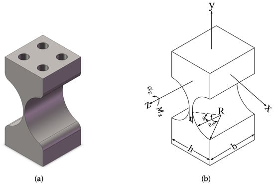 The flexure support structure of our 1-DOF FSM is shown in Figure 3a, which is based on a tangential circular flexible hinge featuring only one rotational degree of freedom. Its force and deformation are illustrated in Figure 3b, where the stiffness of each degree of freedom can be represented by equations from (6) to (9) [].