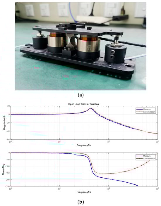 This is a typical second-order oscillation element, consistent with Equation (4) in Section 2. From Figure 5, it can be seen that the system produces a resonance peak at 45 Hz, indicating a first-order resonance frequency of 45 Hz. To validate the accuracy of the co-simulation results, we manufactured a physical prototype, as shown in Figure 6a, which is identical to the simulation model. We conducted the same frequency sweep test on the prototype. Through experimentation, the actual open-loop frequency response results were found to be very similar to the co-simulation results, with minimal error. The matching results of the physical prototype and the experiment with the co-simulation are shown in Figure 6b, demonstrating that co-simulation can predict the dynamic performance of physical prototypes.