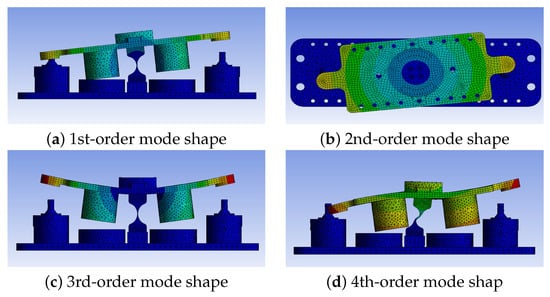 As the scanning frequency increases, the signal excitation will cause resonance in other directions of the system, which is one of the limiting factors of the system bandwidth. The resonance frequencies and mode shapes of the 1-DOF FSM at other orders are obtained through modal analysis, as shown in Table 2 and Figure 7, respectively [,].