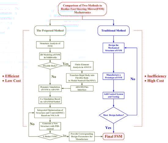 However, the studies above are only applicable to the serial design of FSM, where debugging is carried out based on physical prototypes. If the ultimate bandwidth performance fails to meet design requirements, the entire mechanism may need to be redesigned or redone through iterative optimization, leading to additional time and cost. Some researchers have proposed an electro-mechanical integration simulation method based on FSM, completing the design of mechanical and control systems in the design stage. This accelerates the iterative optimization process and provides guidance for the ultimate manufacture. Y. Lu et al. [] proposed the integrated mechanical control simulation (IMCS) method, predicting the ultimate control performance of the system through simulation. Y. Zhang et al. [] introduced the electromagnetic model of a voice coil motor into the co-simulation of FSM, which improved the completeness of the simulation. However, these methods belong to a serial design in simulation, where each simulation is only applicable to one model. When the simulation results fail to meet the expected design indices, redesign is still necessary.