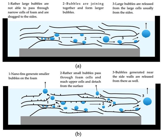 Mechanisms for bubble nucleation on a foam cover: (a) before coating with nanoparticles and (b) after coating with nanoparticles. Adapted from [11].