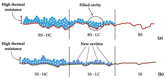 The combined effect of the heating surface roughness and nanoparticle deposition on the nucleate boiling heat transfer was studied by the authors Kiyomura et al. [13], who prepared two rough surfaces coated with low and high mass concentrations of 0.029 g/L and 0.29 g/L, respectively, of iron oxide nanofluids produced by boiling, named RS-LC and RS-HC, respectively. Similarly, two other smooth surfaces were individually coated through low- and high-weight-fraction nanofluids, named SS-LC and SS-HC, respectively. The surfaces were then used for water pool boiling experiments. The obtained results for the water pool boiling showed that the RS-HC and RS-LC surfaces exhibited deterioration of the HTC in comparison with that of the originally rough boiling surface; in contrast, the HTC of the SS-LC was nearly 20% greater than those of the SS-HC and the original plain surface. After coating of the rough surfaces, the nucleation sites density was reduced and the thermal resistance increased as the greater surface cavities were filled with the nanoparticles of the nanofluid and, hence, smaller surface cavities were created. To ensure that the cavities remained active, a higher superheat degree was required; this was not beneficial for the boiling HTC. In contrast, after coating with nanoparticles, the smooth boiling surfaces exhibited an increased number of active nucleation sites. Nonetheless, an excessively thick nanoparticle coating augmented the thermal resistance of the boiling surface; therefore, the SS-LC surface presented better pool boiling heat-transfer characteristics. Figure 2 presents a schematic representation of the deposition of nanoparticles onto the rough and smooth surfaces.