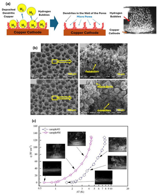 Another example is the work conducted by Rishi et al. [22], in which a porous coating composed of graphene nanoplatelets and copper was synthesized by a multistep electrodeposition procedure. In the procedure, the graphene nanoplatelets were incorporated into the electrolytic, which was deposited on the copper cathode during the electrodeposition process. The super-hydrophilic copper–graphene nanoplatelet coatings enhanced the CHF and HTC by 130% and 290%, respectively.