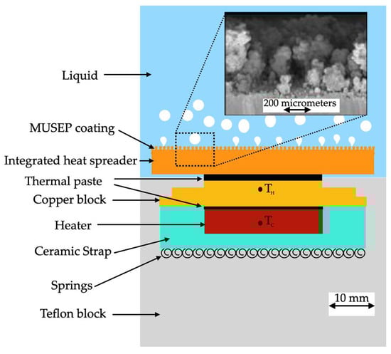 The coating was deposited at room temperature and could be included in off-the-shelf electronic parts like CPUs and GPUs. The commercial heat-transfer fluid Novec® 649 was used in pool boiling experiments along with different heating surfaces: bare copper surface, BEC® surface, and MuSEP coating surface. A 4 mm thick heat spreader, with an area of 22 cm2, was attached to a heater. The best results were achieved with the MuSEP coating, as it could improve the boiling HTC by 108% versus the bare copper surface and by 38% versus the BEC® at 250 W, with an imposed heat flux through the boiling surface of 113 kW/m2. At that power, the case temperature was 68 °C for the MuSEP coating, 79 °C for the BEC®, and 93 °C for the bare copper surface. The solid-to-liquid thermal resistance decreased from 0.186 °C/W to 0.089 °C/W when boiling on the MuSEP coating compared to the bare copper surface. Also, the MuSEP coating exhibited the lowest thermal resistance at a lower power. The durability and effectiveness of the MuSEP coating were confirmed after passing more than 22,000 integrated hours of tests for functioning CPU in a two-phase thermosyphon cooling prototype and more than 5500 integrated hours in a total immersion cooling application. Figure 7 shows the scheme of the pool boiling setup and Figure 8 presents the schematic representation of the heater assembly.