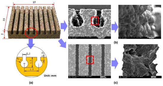 Three-dimensional printed reentrant microchannel structures and SEM imaging: (a) geometry of the reentrant microchannel structures; (b) SEM image of the reentrant microchannels cross-section; (c) SEM top view of the reentrant microchannel structures [46].