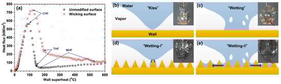 (a) Boiling curves of an unchanged boiling surface and on a wicking boiling surface, and schematic representation of the two sub-regimes during the transition boiling regime on the unchanged and wicking heating surfaces; (b) kiss mode or contact without wetting; (c) wetting mode; (d) wetting-I mode or kiss mode with wicking; (e) wetting-II mode or wetting mode with wicking [51].