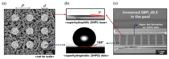 Additionally, Shim et al. [68] synthesized patterned super-biphilic surfaces having distinct super-hydrophobic area fractions and performed pool boiling heat transfer experiments with them as the boiling surfaces. The authors observed that the developed super-biphilic surfaces with wicking effect presented simultaneous enhancements of the CHF and HTC. The local super-hydrophobic dots facilitated the nucleation of vapor bubbles and stabilized the density of active nucleation sites to cause large increases in the boiling HTC. The super-hydrophilic region, which were made of silicon nanowires, possessed a super-hydrophilic character and wicking action to enhance the CHF through a fast fluid supply to the dry regions. To determine the CHF and HTC, the pool boiling experiments were performed using homogeneous wettability and super-biphilic boiling surfaces.
