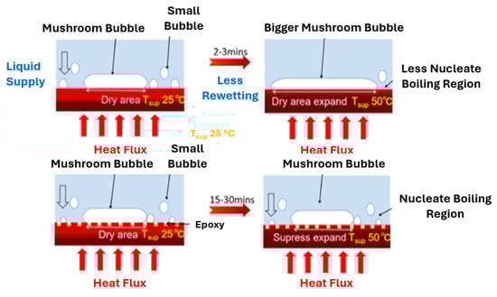 Bertossi et al. [62] developed a switchable wettability boiling surface employing thermo-responsive polymers coated on a stainless-steel surface. When the temperature of the heating surface reached the switching point of the polymer, which is slightly higher than the temperature of the working fluid’s saturation, the wettability of the polymer altered from hydrophilic to hydrophobic; therefore, it promoted vapor bubble nucleation. During the bubble growth, the heat conducted near the triple-phase contact line provoked a localized decrease in the polymer temperature, which switched the wettability back from hydrophobic to hydrophilic. Nevertheless, the HTC enhancement for water was relatively limited, with a result of around 20%.