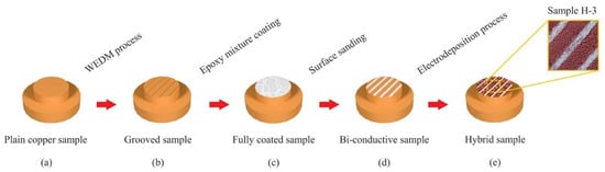 The obtained results showed that the super-biphilic surfaces augmented the boiling HTC; this was the case regardless of the super-hydrophobic fraction of the surface, because of the promoted nucleation and the maximized number of active nucleation sites. The CHF was additionally enhanced on the SBPI_d0.1 surface compared to the H-SHPI surface; meanwhile, in other cases, the CHF decreased. This result overcomes the pending issue of CHF reductions on the super-biphilic surface with wicking due to the suppression of liquid supply to the super-hydrophobic regions. The authors attributed the CHF enhancement to the reduction in the super-hydrophobic area of the surfaces, which maintained the super-hydrophilic and wicking surface area for rapid microscale fluid supply to the dry regions of the surface. Also, another contributor was the fact that the macroscale fluid supply was ensured by the separation of the vapor and liquid pathways to prevent the transition into the film boiling regime. Also, the researchers proposed a dimensionless liquid supply factor, which was employed to confirm the relationship with the CHF. Figure 13 illustrates the fabrication process of the developed super-biphilic surfaces.