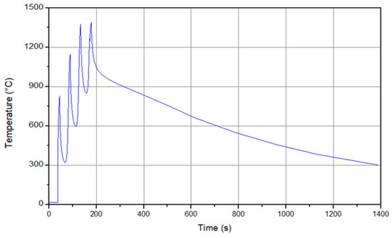 The temperature history results at different layers for the model is described in Figure 1. As can be seen, at the initial step, a sharp increase up to 870 °C in the temperature is observed (at the first and the second layers). This increase is caused by the high pressure from the tool axial force and the filler material [38,39]. Due to the combination of the rotational movement and the axial pressure, deformation of the material happens, and this energy converts to heat, hence an increase in the temperature occurs. Another reason for the heat is the localized heating that is caused by friction. After moving the material along the tool path, the material deposition process occurs layer-by-layer, and this deposition creates a localized heating [38,39]. As can be seen, a maximum value of 1310 °C is obtained at the last layer. Furthermore, during the cooling phase, an almost linear behavior is obtained.