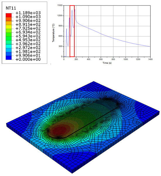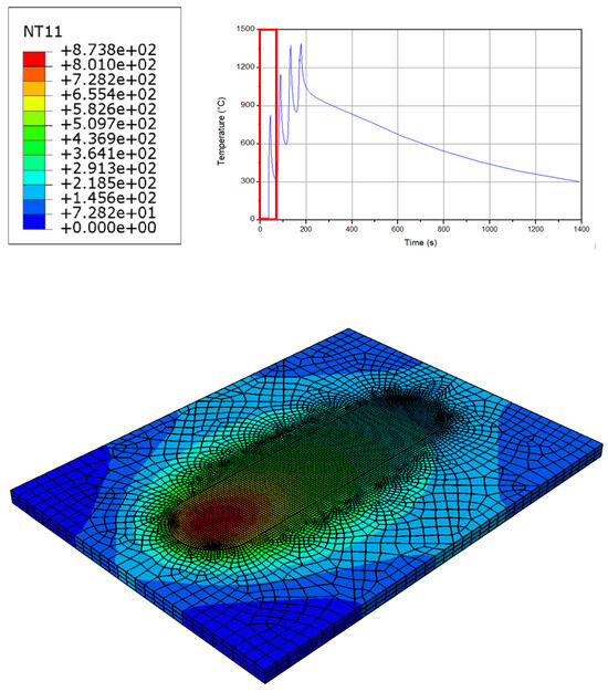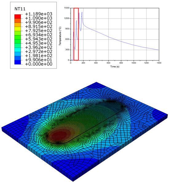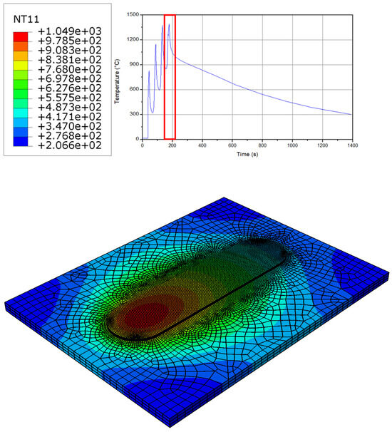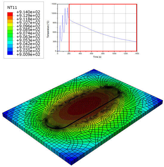 In Figure 5, the temperature profile at the last layer (fourth layer) of the workpiece is shown. From the previous layer, a temperature of 900 °C remains; hence, when compared to the previous layers, a larger heat-affected zone is observed. As the process continues, a decrease in the temperature, due to the heat concentration primarily under the tool, is obtained (due to the sticking behavior). This temperature remains up to 1000 °C (below the material’s melting point). It should be said that the deposition of the material at this phase depends on the heat generated by the friction. This confirms the importance of the highly accurate friction model. It is important to note that the axial pressure on the tool decreases due to the softening of the material that reduces the interlayer adhesion; thus, the integrity of the additively manufactured part is observed. It can be mentioned from the model that, due to the implementation of the Eulerian mesh, the job could smoothly continue up to the last step of the simulation. This indicates that the model’s computational costs are optimized. The literature [31,32] reported that ALE mesh can simulate the process; however, the computational costs and the mesh distortion are critical challenges that require a lot of computational costs, especially at the first layers of the process. In contrast, using the Eulerian model decreases the computational costs, and shows a similar pattern for the simulation. As can be seen, in order to optimize the model, the mesh sizes at the center of the workpiece are larger than at the sides [42,43,44,45].