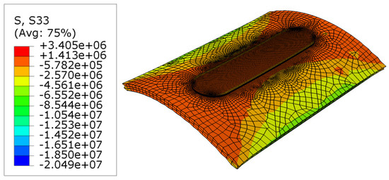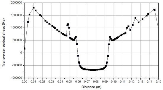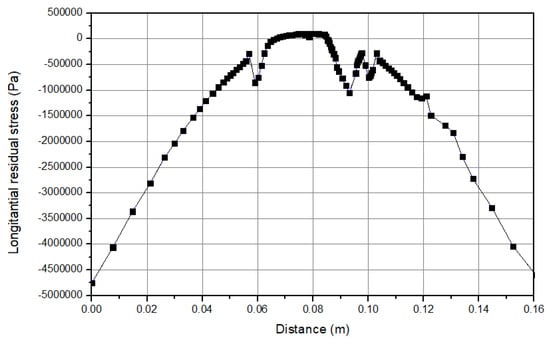 The results of the stress are shown in Figure 7. It is obvious that the parts that face higher temperatures have the highest stress, and this issue can be completely observed at the center of the workpiece. The most significant reason for this issue is the pressure from the tool, and especially the shoulder on the workpiece. Additionally, the filler material pressure on the workpiece causes this peak stress at the center of the workpiece. On the sides of the workpiece there are also some stress results that occur because of the clamping boundary condition. Furthermore, a boundary condition is defined as the clamping of the workpiece. As the process continues, the workpiece tends to have a concave shape, and the clamping force resists against this trend; thus, a high stress is observed at the sides of the workpiece [47,48,49,50]. Figure 8 indicates the longitudinal stress distribution during the process. As can be seen, the values at the center of the workpiece increases up to 5 MPa during the cooling stage. Moreover, a “W” shape behavior is obtained for this stress. This remaining stress could influence the properties and the material behavior. Figure 9 shows the transverse residual stress at the workpiece cross section during the cooling step. The values are around 7 (compression) MPa at the center of the plate. As can be seen, an “M” shape behavior is obtained across the workpiece cross section. This shows that at the sides of the workpiece higher stress is obtained in comparison to the center [47,48,49,50].