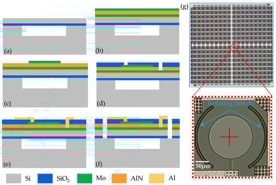 (a–f) Fabrication process flow of the PMUT array. (g) Optical image of the fabricated PMUT array.