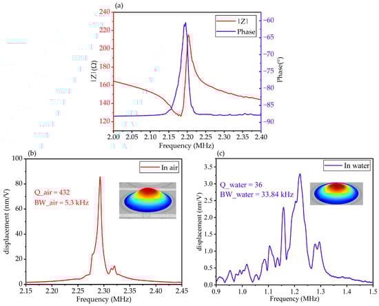 The mechanical vibration properties were characterized by a laser Doppler vibrometer (MSA-600, Polytec GmbH, Waldronn, Germany). The displacement–frequency spectrums of the same PMUT element in air and deionized water are depicted in Figure 3b,c, and the insets are the first resonant mode of the PMUT. In air, the first-order resonant frequency of the PMUT was 2.2925 MHz, and the −3 dB bandwidth was 5.3 kHz. When immersed in deionized water, the resonant frequency of the PMUT decreased to 1.2206 MHz, and the −3 dB bandwidth expanded to 33.84 kHz, because of the mass loading effect []. The in-water −3 dB bandwidth of the PMUTs prepared in this paper is larger than that (20.3 kHz) in previous work []. The quality factor (Q) of the PMUTs is defined by the following Equation (3):
