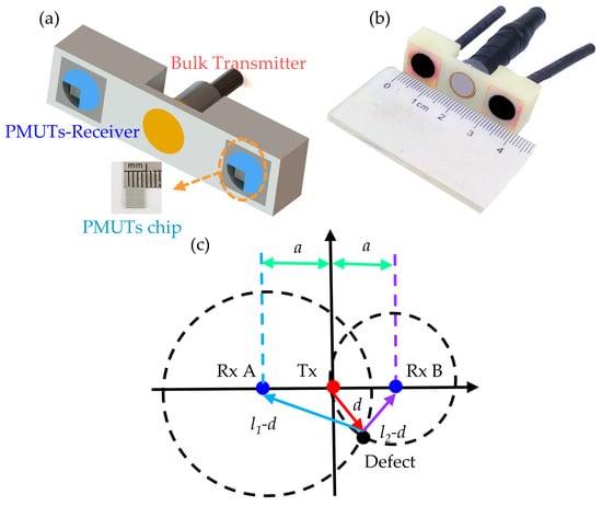 The position of the defect could be determined by the TOF difference between two different receivers. Figure 4c illustrates the theory of 2D defect localization. The ultrasonic wave radiated into the sample by the bulk piezoelectric transducer will be reflected by the inner defect and received by the PMUT receivers. The TOF of Receiver A and Receiver B is tA and tB, and the longitudinal sound velocity in the sample is c (c ≈ 6000 m/s); we then have the following:
