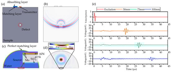 The second simulation model (Pressure Acoustics, Time Explicit) is shown in Figure 5c. The PMUT was placed in a semicircle water domain covered by a perfect matching layer. A line source with sound pressure acquired in the first part was placed 1 mm above the PMUT. The PMUT was modeled as a laminate consisting of Mo electrodes, an AlN piezoelectric layer, a Si vibrating layer, and buried SiO2. Figure 5d presents the distribution of sound pressure in the water medium. The normal excitation velocity and received signals of defects located at 50/75/100 mm depth are depicted in Figure 5c. The TOF of the 50/75/100 mm defect was 18.27/26.14/32.36 μs.