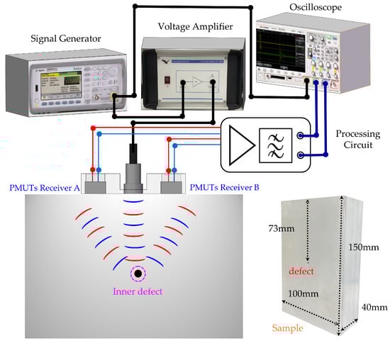 The setup of the ultrasonic testing experiment and test sample are shown in Figure 6. A conventional bulk piezoelectric transducer with a 1.25 MHz resonant frequency was employed as the transmitter. A three-cycle sine wave with 1.25 MHz frequency and 6 Vpp amplitude was generated by a function generator (33600A, Keysight Technologies, Santa Rosa, CA, USA). Then, the burst signal was amplified 25 times by a voltage amplifier (WMA-300, Falco Systems, Katwijk aan Zee, The Netherlands) to drive the transmitter. Furthermore, 6061 aluminum alloy cubes with 2 mm diameter holes located 50/73/97 mm deep were prepared as test samples. The output signals of the PMUT receivers were amplified and denoised by a front analog processing circuit (30 dB, −3 dB width, 272 kHz–2.2 MHz). Afterward, the received signals were displayed and acquired by an oscilloscope (DSOX2014A, Keysight Technologies, Santa Rosa, CA, USA). A gel ultrasonic matching agent was coated between the sensors and test samples for coupling.
