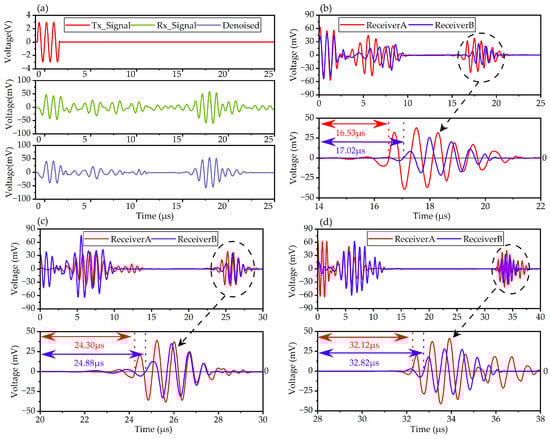 Wavelet denoising is a suitable conditioning method for ultrasonic echo signals []. Based on the wavelet transform theory, the original signal was decomposed into many wavelet bases, and noise signals with features different form the ultrasonic pulse were eliminated. The ultrasonic pulse was kept and reconstructed as a denoised signal. The acquired signal was postprocessed with wavelet denoising using MATLAB’s Wavelet Signal Denoiser tool (R2021a). The wavelet denoised signal is also depicted in Figure 7a. After wavelet denoising, the SNR of defect echo was 33.52 dB, which is greatly improved compared with the original signal. From the wavelet denoised signal, the TOF of the defect echo was 16.64 μs whereas the simulated TOF was 18.27 μs, which is caused by the model deviation. When the transmitter is not directly above the defect, the TOFs of the defect echo received by Receiver A and Receiver B are different. The relative position of the defect can be figured out by the difference in the TOFs. The received signals of defects located at different relative positions are shown in Figure 7b–d.