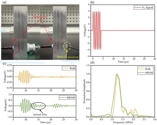 (a) Schematic of the receiving experiment. (b) Excitation signal. (c) Received signal by bulk transducer and MEMS sensor. (d) FFT of the received signal.