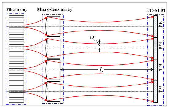 3]. During the design of this M × N port WSS, multiple parallel beams from M input ports transmit a long distance to reach the liquid crystal spatial light modulator (LC-SLM), with the light spots from each port non-overlapping in the LC-SLM. Since long transmission distances will lead to the serious dispersion of Gaussian beams, the most pressing challenge is determining how to design the micro-lens to ensure that the incident focused spot size remains as small as possible during free-space transmission while maximizing the number of focused spots within the constrained area of the LC-SLM [