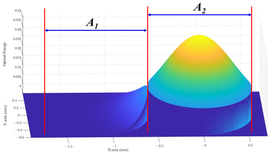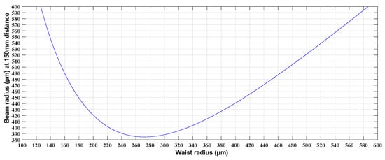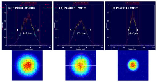 1). Due to the left–right symmetry of the Gaussian beam, the beam’s spot size in the LC-SLM plan at a transmission distance of 150 mm can be calculated from Equation (