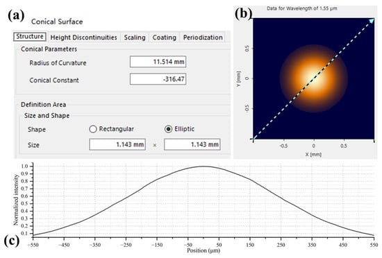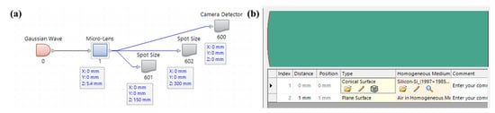 For the simulation of the mode field diameter of the single-mode fiber’s end face, the light source is configured as a Gaussian beam with a wavelength of 1550 nm and a beam waist radius of 5.2 μm. The following step requires the configuration of micro-lens parameters, including important considerations such as material selection, focal length, and radius of curvature.