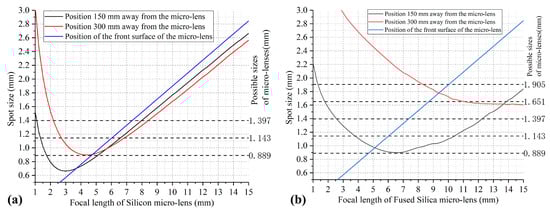 Figure 8, when the silicon micro-lens has a size of 1.143 mm and a focal length of approximately 5 mm, the beam’s spot size remains below 1mm throughout the transmission process. In contrast, the fused silica micro-lens must have a minimum