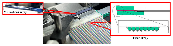13]. The fiber array with a 127 μm pitch, readily available from the Planar Lightwave Circuit (PLC) optical splitter, is precisely arranged in a one-dimensional array. Owing to the utilization of spaced fibers in our system, the dimensions of each micro-lens are meticulously designed to be integer multiples of 127 μm, such as 635 μm, 762 μm, 889 μm, 1016 μm, and 1143 μm.