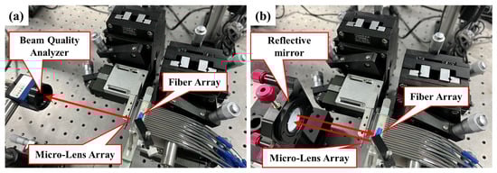 Figure 10a, a high-precision six-dimensional adjustment platform was used for the accurate alignment of fibers with the micro-lens. In the experimental process of aligning the fibers with the micro-lens, the first step was to adjust the spacing between the fibers and the micro-lens to minimize loss, and then, adjust the rotation angle of the micro-lens. The position of each port was adjusted appropriately based on the beam quality analyzer imaging to achieve optimal alignment for all ports.