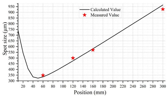 Figure 14, the experimental results align closely with the calculated values. The beam waist is located about 50 mm from the micro-lens, with a beam waist radius of 251 μm. The beam’s