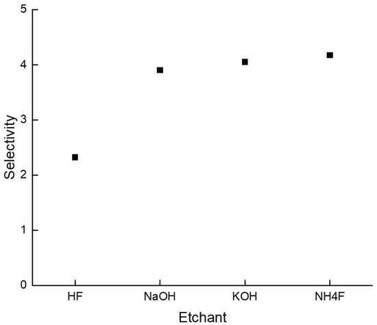 | Etchant | Modification Etch Rate (μm/h) | Non-Modification Etch Rate (μm/h) | Selectivity |