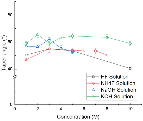 - The results also reveal that the taper angle of a blind hole is affected by the etchant. The etchant itself determines the taper angle. HF, NH4F, NaOH, and KOH solutions generated 41°–53°, 47°–60°, 53°–62°, and 58°–66° taper angles, respectively. This study might be helpful for those who want to generate holes with certain angles. However, we still need to understand the principle underlying the phenomena identified in this study.
