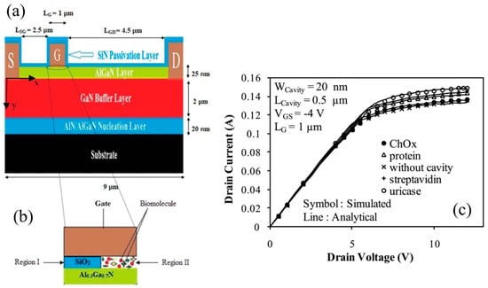 (a) Structure of AlGaN/GaN MOSHEMT with nanogap cavity under the gate. (b) Expanded view of cavity region introduced below gate region. (c) The output curves of simulated and analytical model for ChOx, protein, streptavidin and uricase biomolecules. Reprinted from reference [].