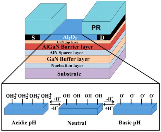 It is known that the 2DEG channel naturally exists at the AlGaN/GaN interface due to polarization, allowing AlGaN/GaN HEMT-based biosensors to operate without a gate electrode [,]. Figure 3 exhibits a schematic illustration of AlGaN/GaN HEMT pH sensing [], where Al2O3 is deposited by the atomic layer deposition technique. This layer serves as both the sensing membrane and the device’s passivation. By doing so, a large binding region and a chemically stable interface are achieved. The surface potential of the sensing region depends on the surface charges, which change by attracting counter-ions when exposed to detection samples. Correspondingly, the density of the 2DEG at the AlGaN/GaN interface increases with positive charge attraction or decreases with negative charge attraction []. Therefore, the properties of the sample can be detected by monitoring changes in the output current.