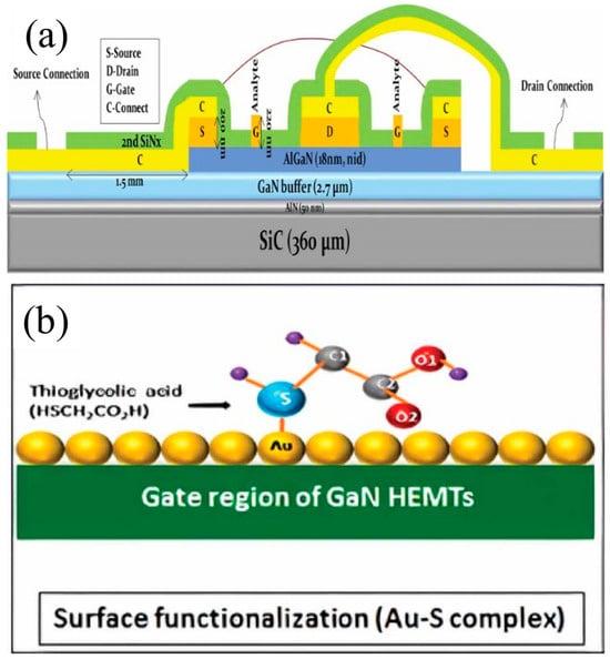 (a) Design of GaN HEMT based biosensors. (b) Surface functionalization of gold with TGA and antibody. Reprinted from reference [].