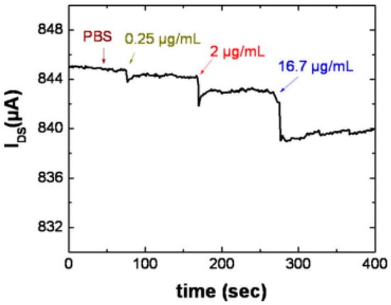 Drain current of an AlGaN/GaN HEMT-based biosensor over time for c-erbB2 antigen from 0.25 to 17 μg/mL. Reprinted from reference [].