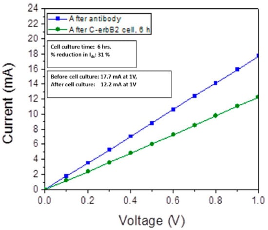 Response of the biosensor after incubation in human cell line positive for breast cancer biomarker C-erbB2. Reprinted from reference [].